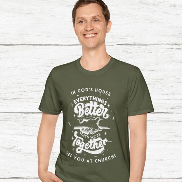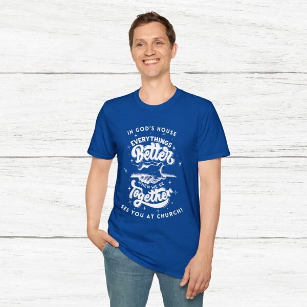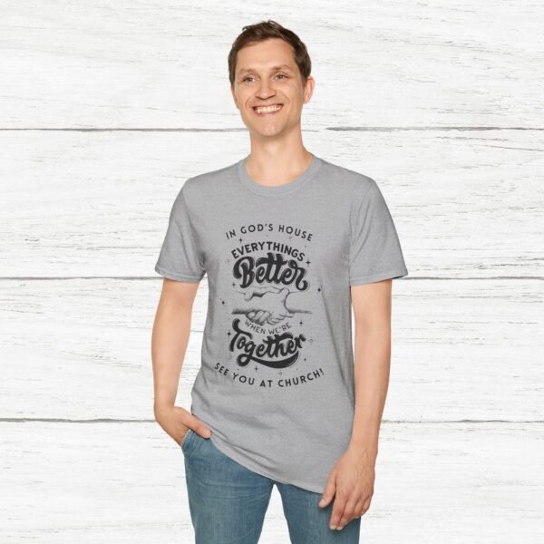 This unisex softstyle t-shirt features a design that says ‘In God’s house everything is better when we are together,’ focusing on encouraging people to come to church. Hebrews 10:24-25 says, “And let us consider how to stir up one another to love and good works, not neglecting to meet together, as is the habit of some, but encouraging one another, and all the more as you see the Day drawing near.” Let us come together as the day draws near. This t-shirt is made from 100% ring-spun cotton, offering a lightweight and comfortable feel. The classic fit and crew neckline make it versatile for any occasion, from formal to semi-formal. Ideal for adults looking for a stylish and meaningful shirt to wear out and about, to church, or other gatherings.